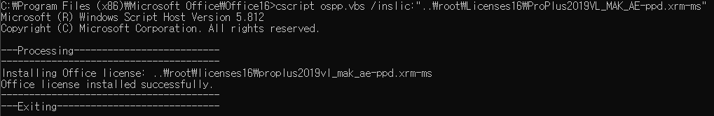 cscript ospp.vbs /inslic:"..\root\Licenses16\ProPlus2019VL_MAK_AE-ul-phn.xrm-ms"