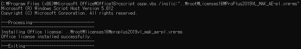 cscript ospp.vbs /inslic:"..\root\Licenses16\ProPlus2019VL_MAK_AE-pl.xrm-ms"