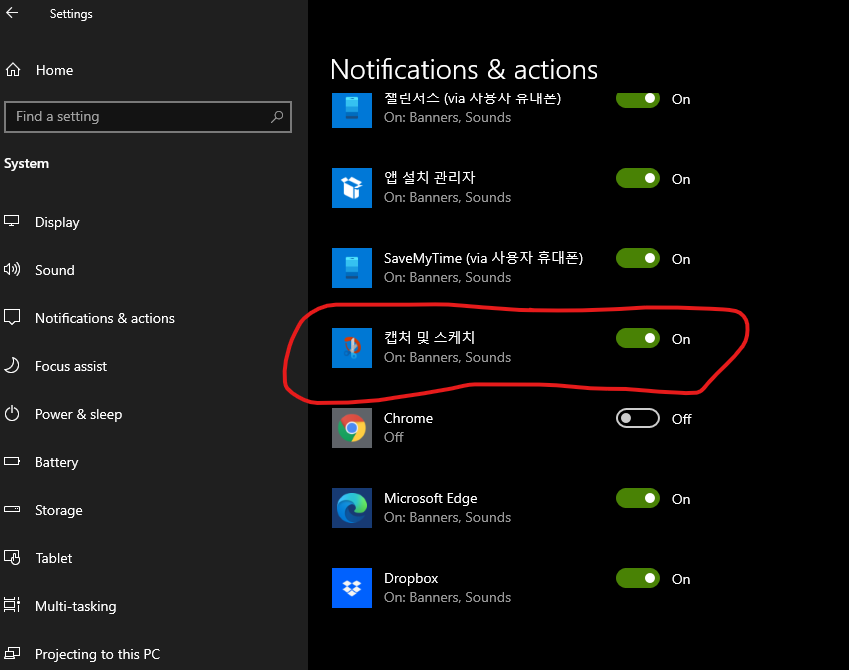 여기를 쭉 내려보면 캡쳐 및 스케치가 off 되어있을 것이다...ㅠ