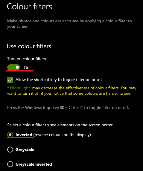 윈도우 검색창에 color filter로 검색하면 요게 뜬다.