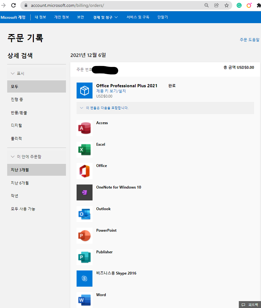 Microsoft 계정 페이지 로그인 후 > 결제 및 청구 페이지를보면,