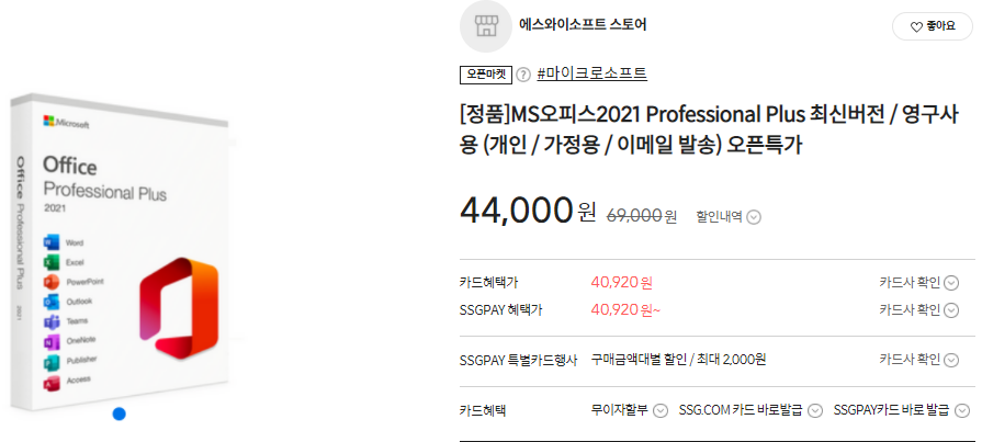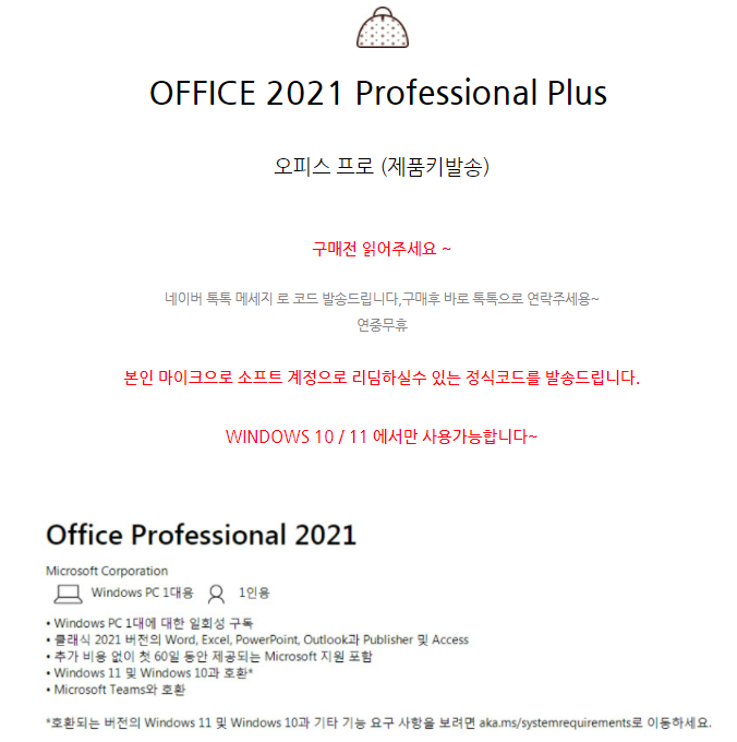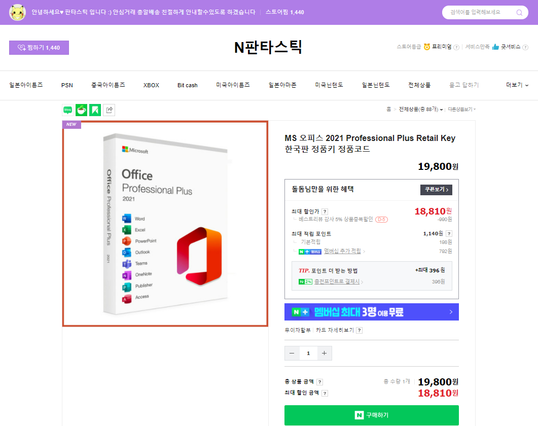 MS 오피스 2021 Professional Plus Retail Key 한국판 정품키 정품코드 : N판타스틱