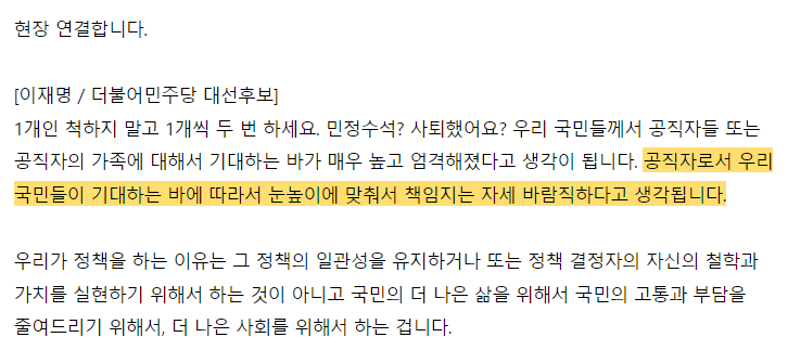 공직자로서 국민들이 기대하는 바에 따라서 눈높이에 맟춰서 책임지는 자세 바람직