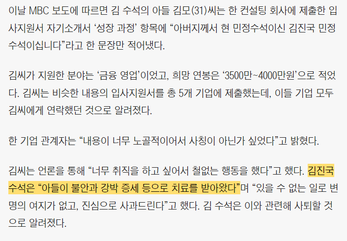 아빠민정수석이니 취업시켜달라고 서류로 와드박은 김진국아들 ㅋㅋ