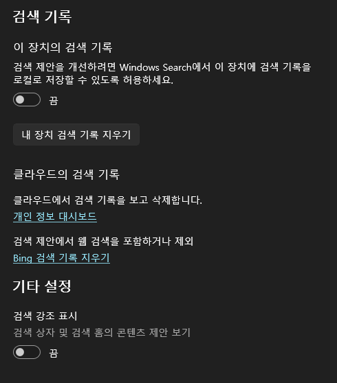 *개인정보 및 보안 > 검색권한 > 검색기록