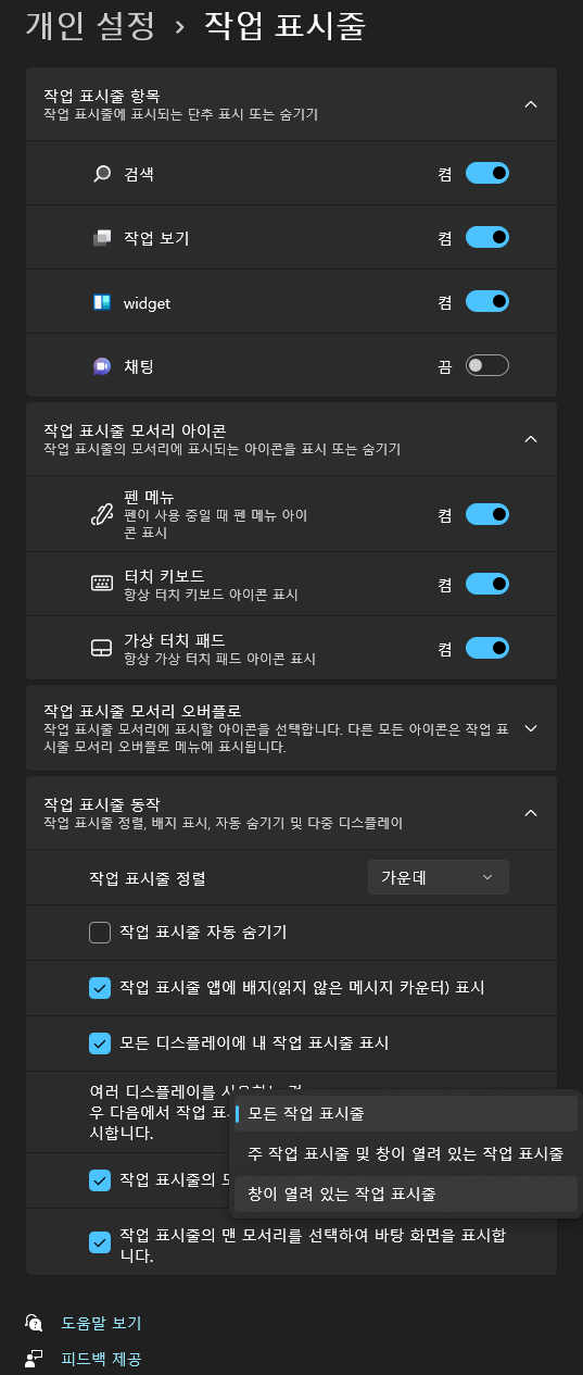 * 개인설정 > 작업표시줄