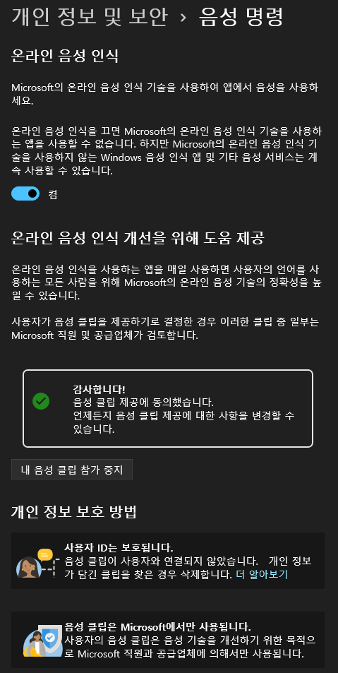 * 개인정보 및 보안 > 음성명령