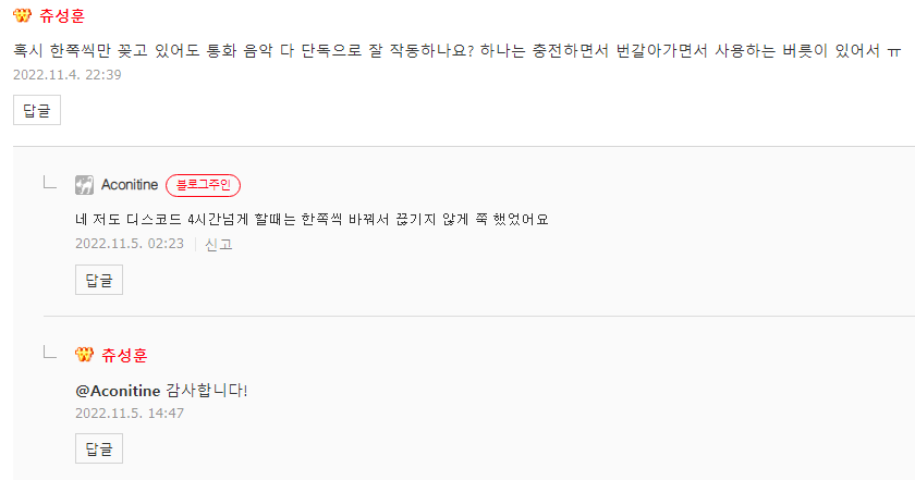 아무도 한쪽 사용에 대한 리뷰를 해주진 않길래 일일이 댓글 달아가며 물어보는 와중에
