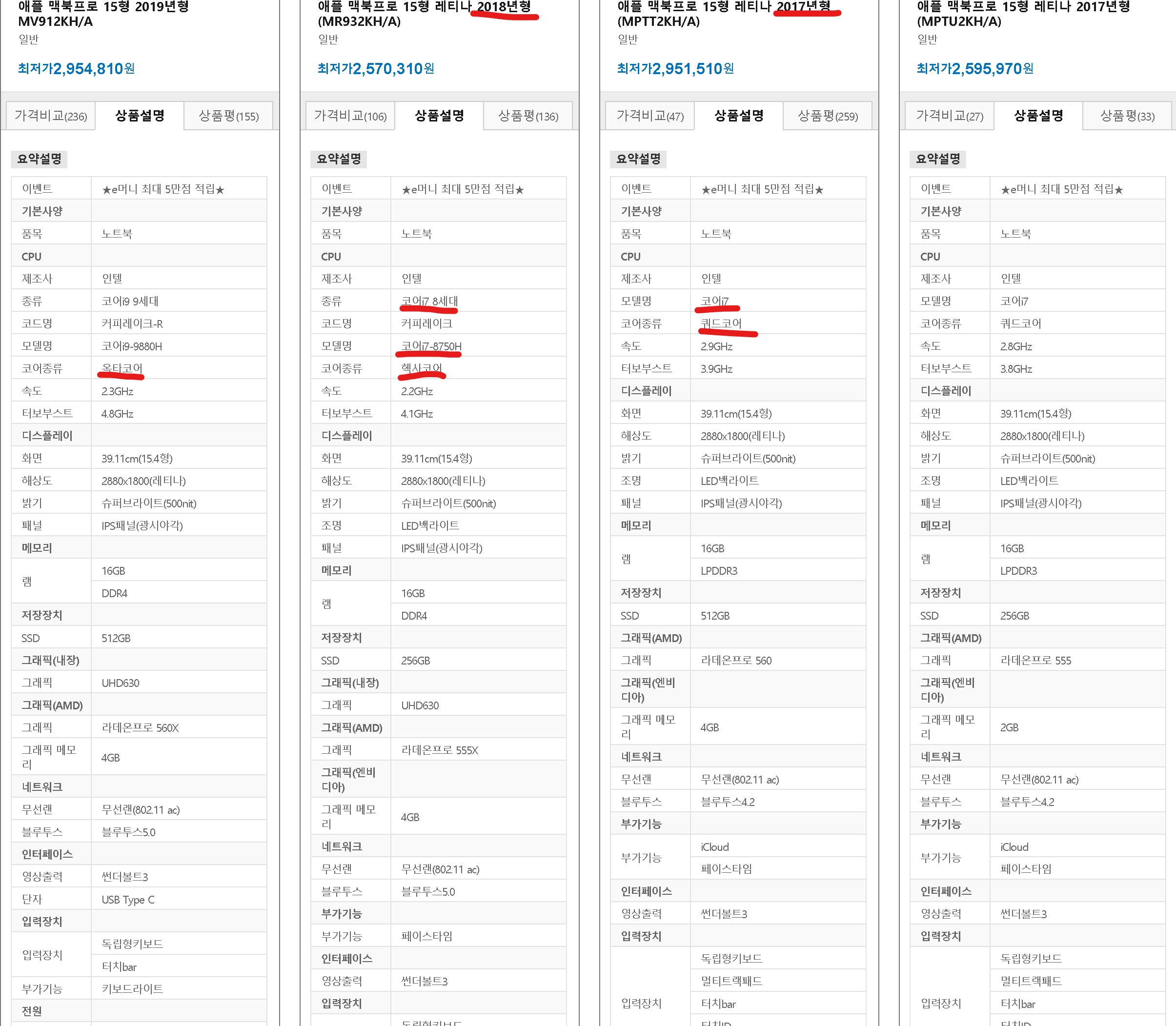 그리고 2018년모델부터 CPU가 8세대에 쿼드코어를 벗어난다.