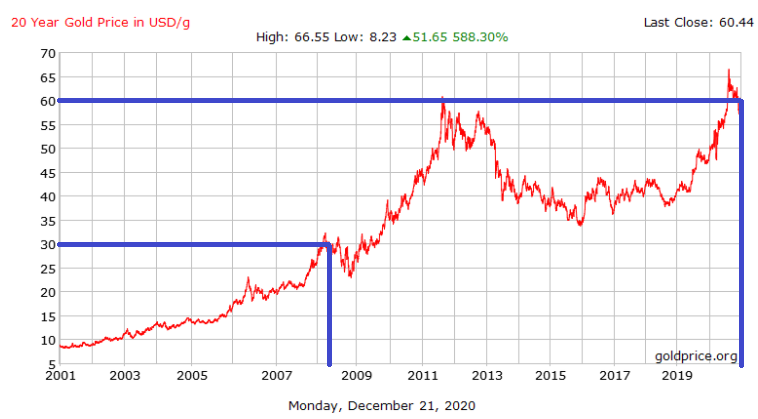 금값은 g당 30$에서 60$로 정확히 두 배 뛰었는데,